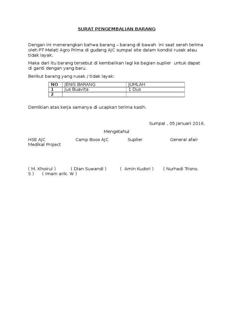 24 Draf Surat Permintaan Pengembalian Barang Milik Perusahaan Manta from image.slidesharecdn.com Surat permohonan uji tes tekan beton. Contoh surat perjanjian konsinyasi atau titip jual sederhana detiklife. Contoh surat berita acara pengembalian barang rusak. Contoh surat komplain pengaduan barangproduk beserta. Berikut ini contoh surat pengaduan atau komplain barang rusak. Documents similar to surat pengembalian barang copydocx. Produk dikatakan bagus jika tidak ada cacat fisik dan tidak rusak. Sekarang ini ada beberapa jasa pengiriman kilat yang berdiri di indonesia.